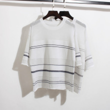 夏季韩版宽松条纹五分中袖薄针织衫套头圆领防晒罩衫大码棉麻T恤