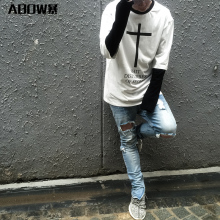 ABOW简约十字架印花t恤长袖圆领潮男体恤假两件高街搭配卫衣男潮