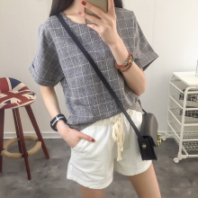 2017夏装新款简约文艺范棉麻格子学生上衣女宽松百搭圆领短袖T恤