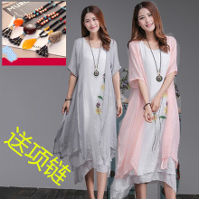 包邮夏装新款200斤背心裙两件套宽松大码女装文艺棉麻连衣裙套装