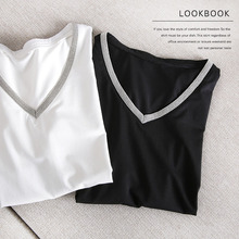 出口订单 精致手工钉珠V领短袖弹力舒适棉T恤上衣女2017夏季新品