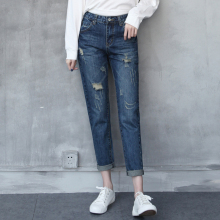 2017春季新品韩版高腰九分宽松破洞牛仔裤女哈伦裤显瘦直筒裤潮
