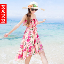 波西米亚海边度假沙滩裙连衣裙子 短吊带碎花雪纺裙