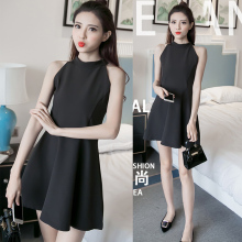 夏季新款赫本A字小黑裙露肩挂脖短裙子显瘦修身性感名媛连衣裙