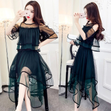 夜店2017夏装新款套装女名媛气质修身显瘦松紧腰中长款网纱两件套