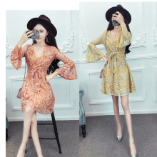 2017春夏韩版女装名媛收腰显瘦印花v领蝴蝶结性感夜场气质连衣裙