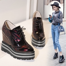 春秋新款真皮坡跟单鞋女高跟防水台厚底松糕鞋尖头系带休闲鞋女鞋