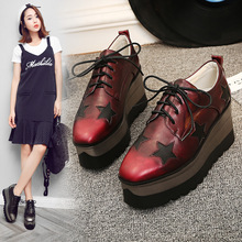 春秋新款方头星星松糕鞋女真皮厚底坡跟单鞋英伦系带休闲鞋女鞋子