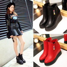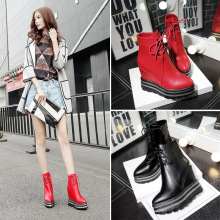 秋冬新款坡跟短靴子女超高跟防水台厚底松糕鞋短筒女靴真皮马丁靴