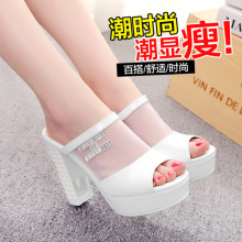 韩版2017夏季新款网纱鱼嘴凉鞋女粗跟高跟凉拖鞋女室外一字拖女鞋