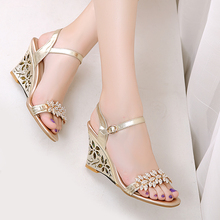 新款韩版夏季真皮坡跟厚底女凉鞋高跟女鞋子羊皮水钻罗马女凉鞋子