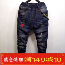 童装冬款中童加绒牛仔裤男童小脚裤个性补丁女童棉裤保暖裤儿童裤