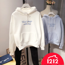 2017春冬款韩国简约纯色刺绣字母加绒保暖连帽女卫衣宽松运动休闲