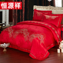 恒源祥婚庆大红四件套全棉贡缎提花欧式结婚床单被套纯棉床上用品