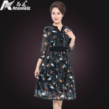 夏季2017中老年女装网纱雪纺连衣裙夏装新款妈妈装花色假两件裙子