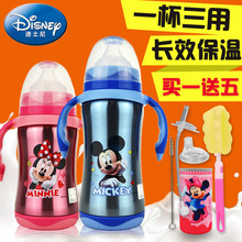 迪士尼新款儿童多功能保温壶304不锈钢保温奶瓶三两用双柄吸管杯