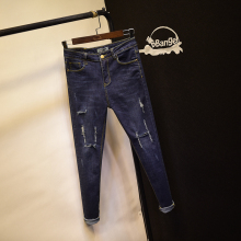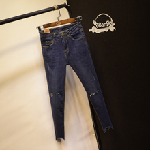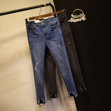 2017夏季磨破洞紧身牛仔裤女式弹力修身显瘦九分裤百搭小脚铅笔裤