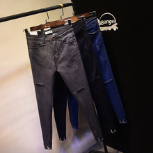 韩范烟灰色磨破洞小脚铅笔裤女弹力修身长裤 显瘦黑色高腰牛仔裤