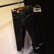2017基础百搭简约铅笔裤女显瘦高腰黑色牛仔裤弹力修身卷边小脚裤