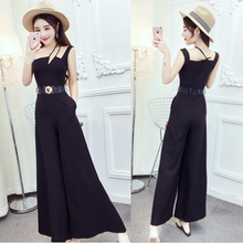 2017夏季新款韩版名媛时尚双肩带前后V领修身高腰阔腿裤连体裤女