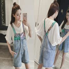 夏季新款韩版时尚白T恤亮片拼接牛仔背带裤女热裤短裤2件套装潮女
