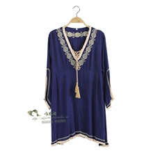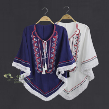包邮 唯思淘 民族风刺绣流苏系带斗蓬式棉绸衬衫宽松上衣夏C413