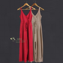 包邮 欧美风高腰抽绳收腰针织深V领吊带连体裤阔腿裤长裤B111