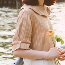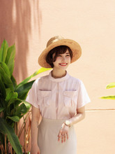 CREAMCHILD16夏原创设计独家定制清新粉白格口袋小圆领短袖衬衫女