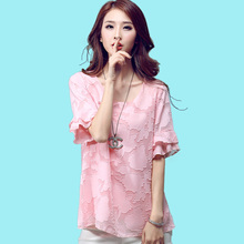 大码女装夏装2017新款潮胖mm短袖t恤荷叶边雪纺衫胖妹妹宽松上衣