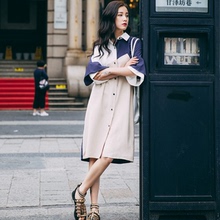 春夏新款欧美休闲中长款衬衣裙拼色拼接超宽松中袖衬衫连衣裙女潮