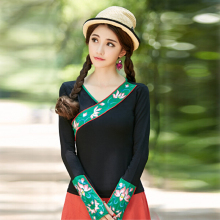 2017春装上衣 绣花民族风女装t恤女长袖 修身大码刺绣棉质打底衫