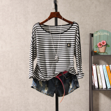 2017春装新款韩版圆领长袖蝙蝠袖条纹棉T恤女大码宽松显瘦打底衫