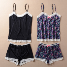 日系大牌欧美欧美牛奶冰丝仿真丝碎花V领蕾丝吊带睡衣套装女士夏