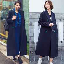 2017秋冬新款明星高圆圆同款藏蓝色绿扣子长款毛呢大衣外套欧美大