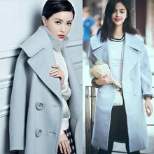 2017秋冬明星同款郭采洁小时代3顾里浅蓝色大翻领毛呢大衣外套女