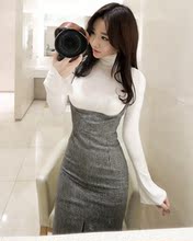 韩国代购2015冬款11.25气质高领喇叭袖修身打底衫+高腰背带裙单买