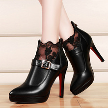 盾狐2016秋冬新款深口单鞋女高跟鞋细跟尖头蕾丝女鞋防水台及裸靴