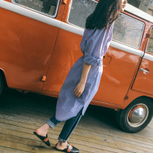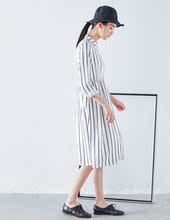 中长款衬衫女长袖条纹衬衣2017春装新款韩版腰带连衣裙直筒宽松