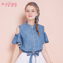 2017阿依莲牛仔系带蝴蝶结衬衫女荷叶袖短款露肩预售6月5号发货