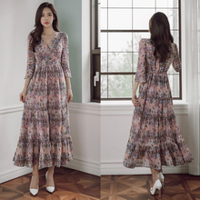 2017夏季新款韩国chic风优雅碎花V领收腰长款七分袖森女连衣裙女