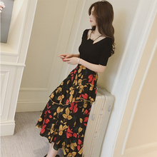 春季新款韩版短袖t恤中长款连衣裙套装女不规则碎花半身裙两件套