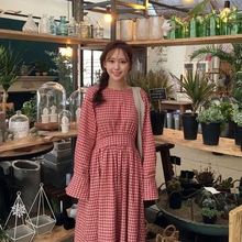 2017韩国代购春装新款甜美格子长袖打底裙收腰后背蝴蝶结连衣裙女