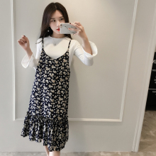 韩版圆领白色喇叭袖打底衫2017春装碎花吊带鱼尾裙两件套连衣裙女