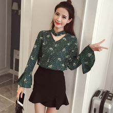 2017韩版复古蝴蝶结碎花雪纺衬衫喇叭袖百搭v领镂空打底上衣女
