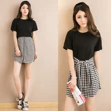韩国代购明星同款韩版圆领t恤休闲假两件收腰格子绑带打结连衣裙