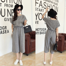 韩版格子休闲阔腿裤套装新款棉麻短袖上衣七分阔腿裤套装时尚套装