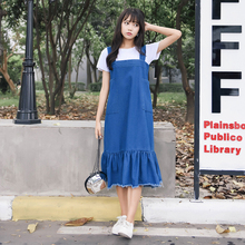2017新款荷叶边拼接背带牛仔长裙韩版流苏鱼尾裙吊带连衣裙夏新款