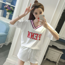 2017夏季新款韩版学院风拼色螺纹V领印花短袖系带短裤简约两件套