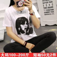 大码女装200斤胖mm夏季新款2017印花圆领短袖T恤胖妹妹打底衫上衣