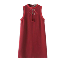 2017春季新款原创女装东方元素编织绑带圆领无袖胭脂深红连衣裙